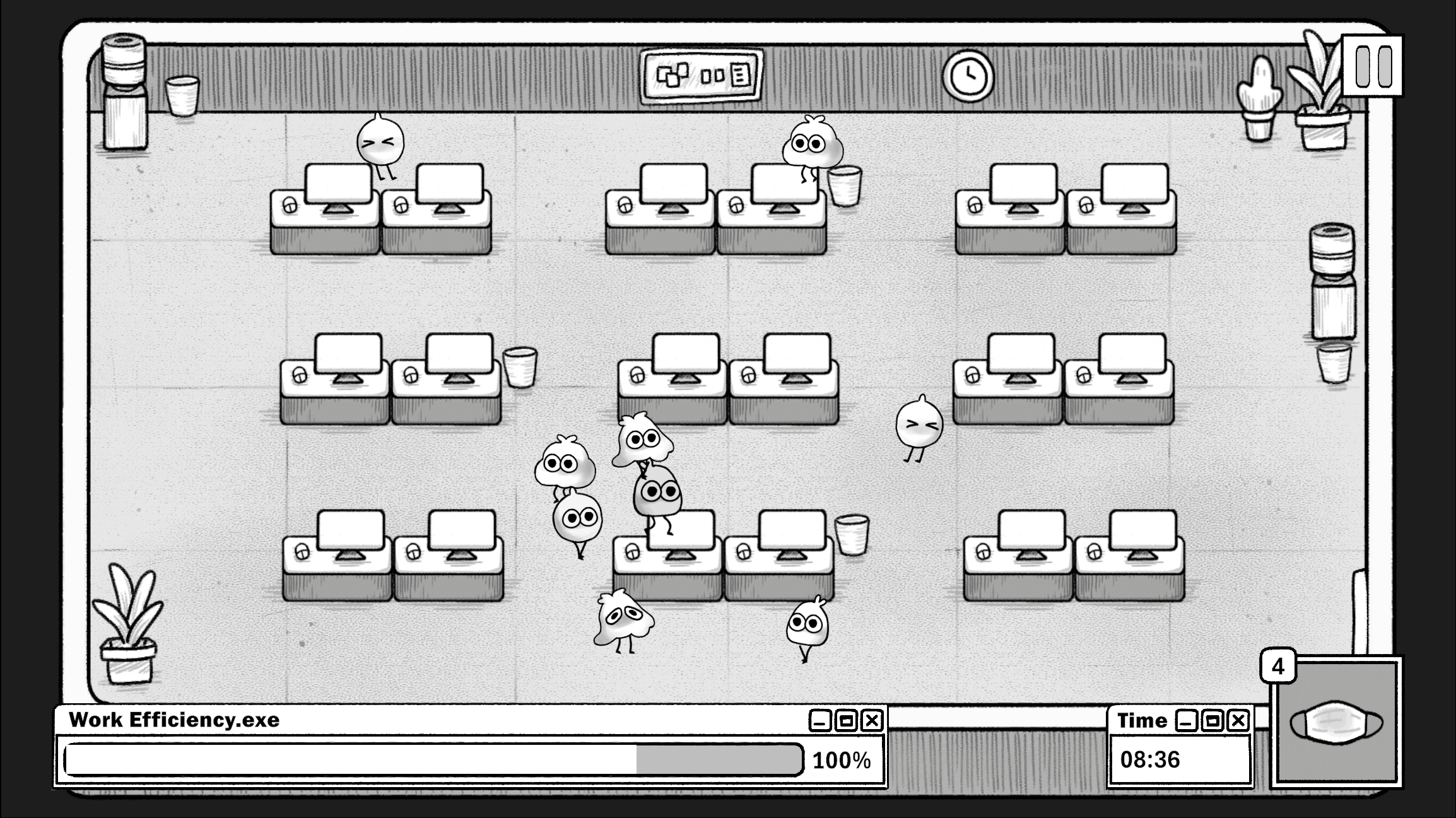 Your boss has tasked you, Chad, to mask your workers and keep them from getting sick! Better work efficiency means more company stonks (and validation from your boss).